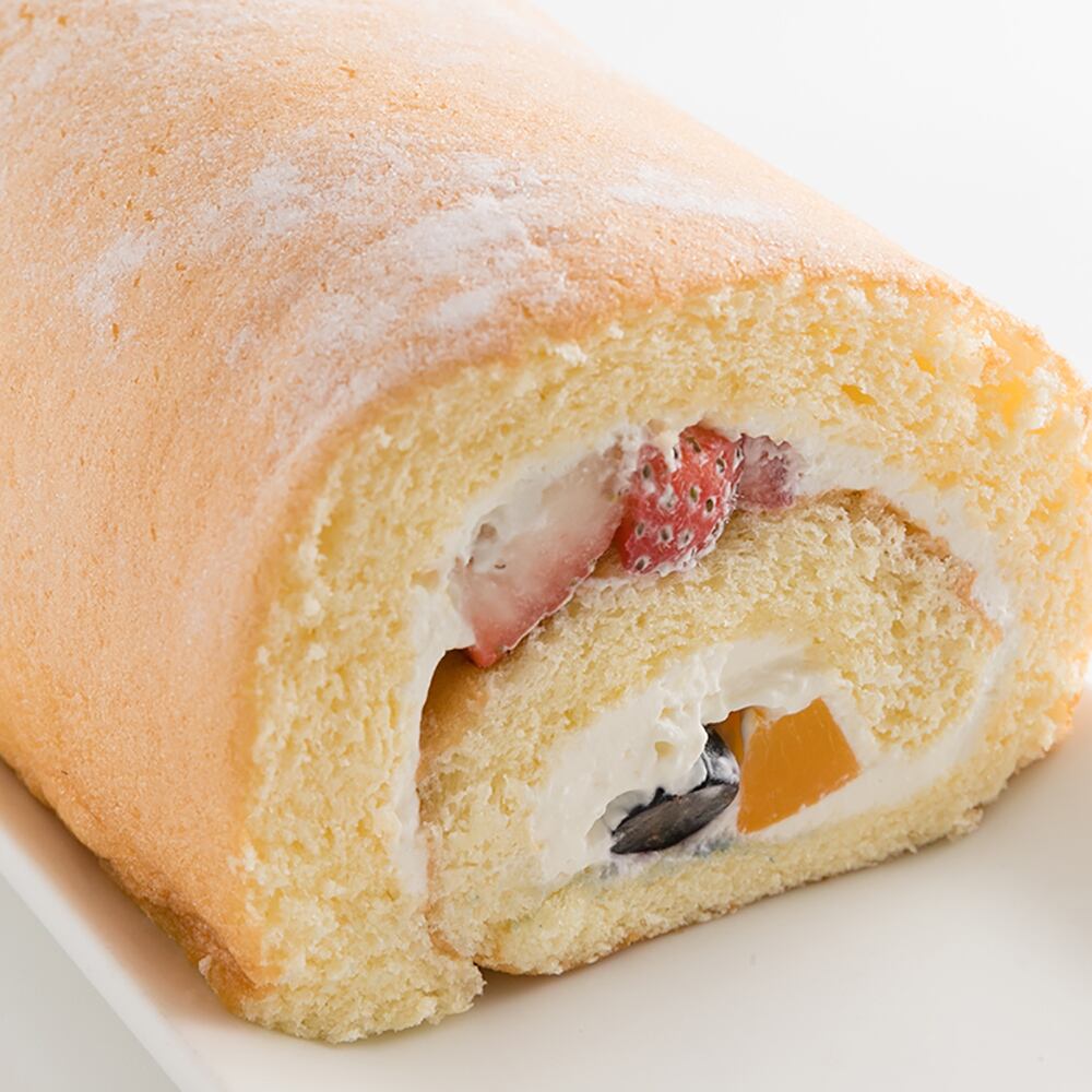 ふわふわのロール生地で3種類のフルーツを巻いています。フルーツはイチゴ・黄桃は必ず入っております。キウイ・パイン・ブルーベリーが日によって変更されます。